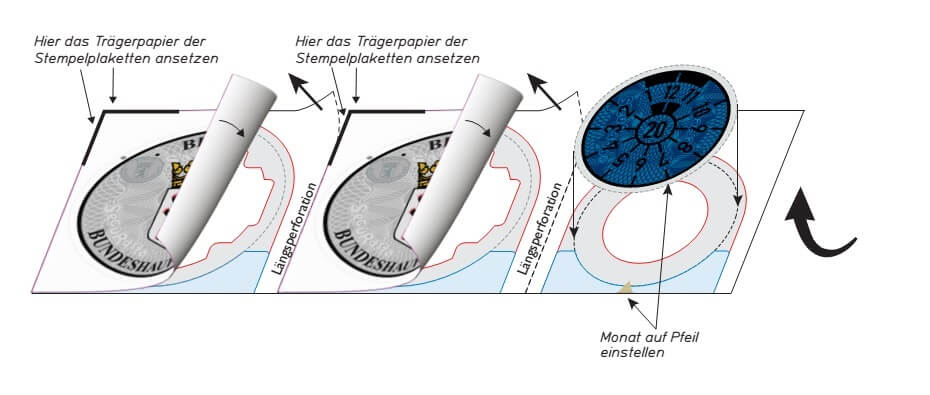 Nach der Bedruckung das untere Abdeckpapier entfernen, den gesamten oberen Teil der Plakettenträger entlang der Querperforation nach unten umklappen und mit dem unteren Teil des Plakettenträgers fest verkleben. Dadurch sind die variablen Daten dauerhaft geschützt. Der Plakettenträgerbogen verfügt über zwei Längsperforationen. Gemäß des jeweiligen Zulassungsvorgangs den benötigten Teil abtrennen.