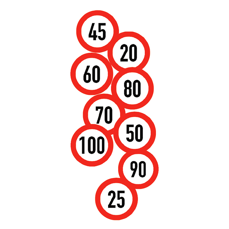 (XX = bitte bei Bestellung die gewünschte Geschwindigkeit angeben, z.B. Artikel-Nr. 9000090-60 für Zeichen 60 km/h)
